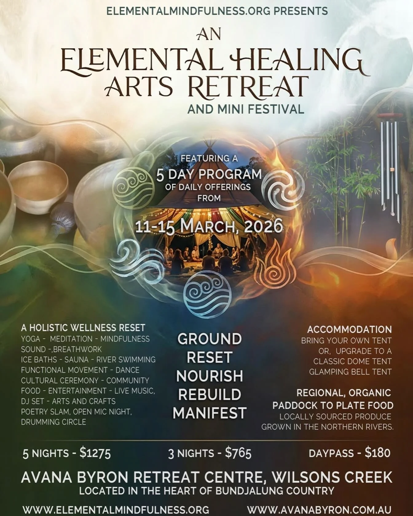 The Elemental Healing Arts Retreat is the perfect place to ground in nature, engage in active relaxation, reconnect with the land, the breath and the heart and practice functional movement and full self expression while also nourishing the physical body.